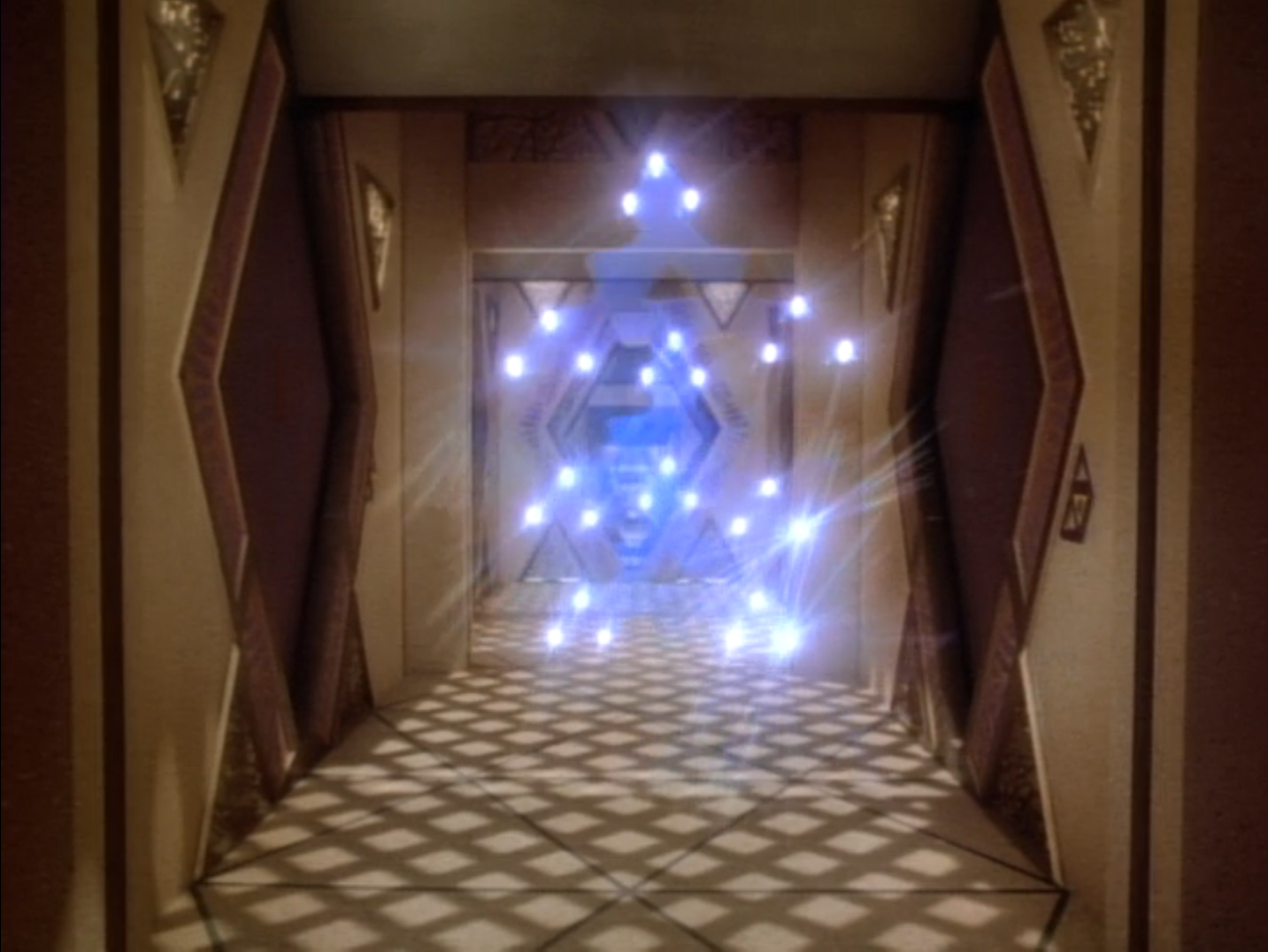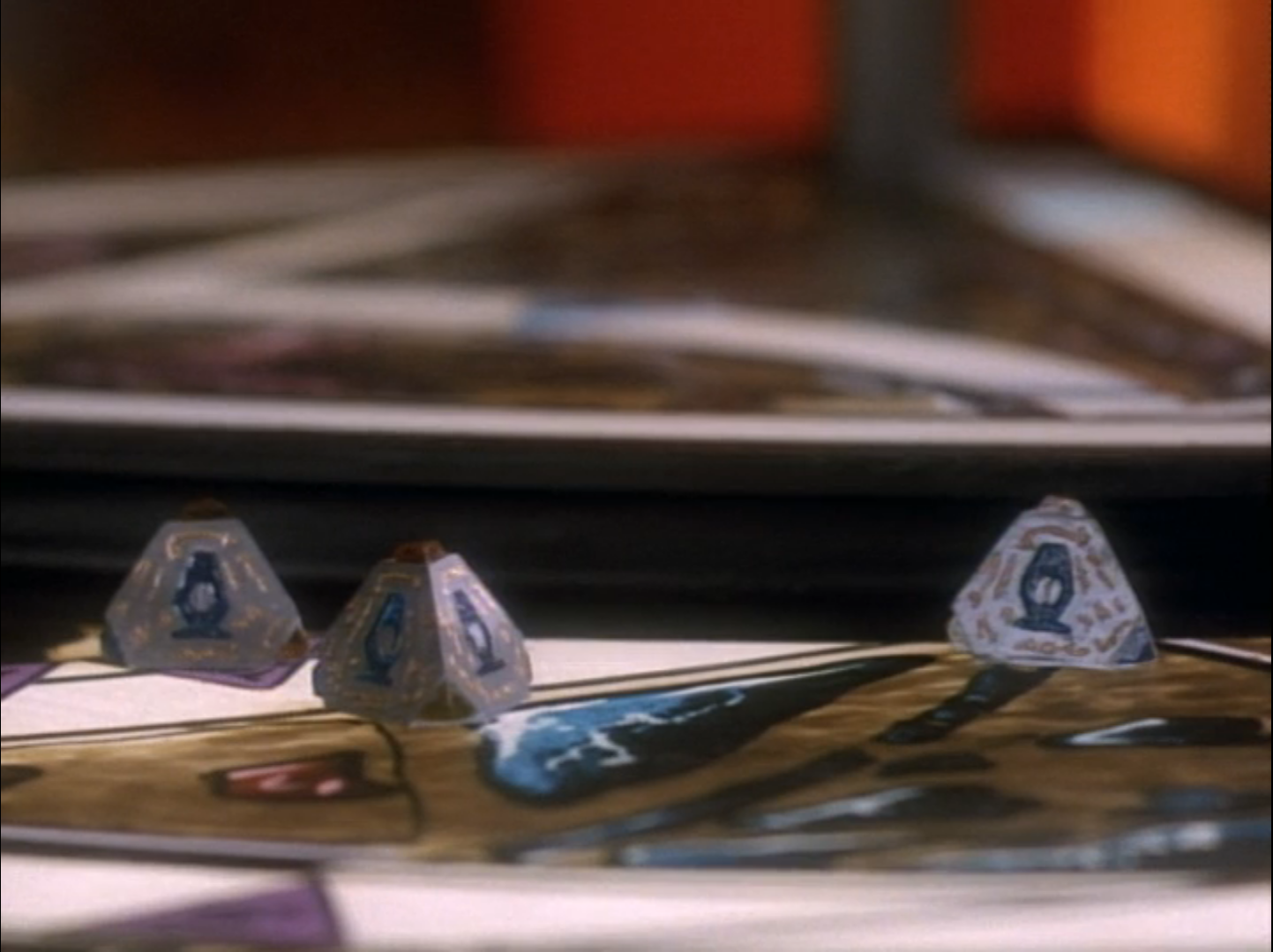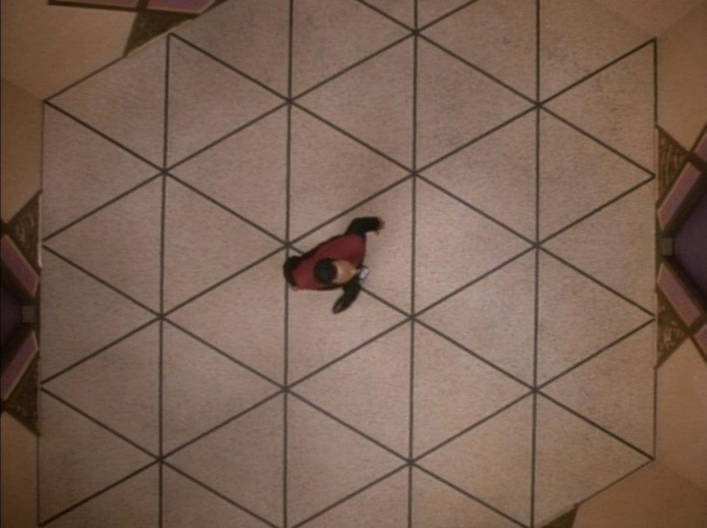 Quark sets up a means of barter so that they may gamble. They are apparently good at it somehow and win a lot. Then Quark intercedes and rigs the game, as if it was necessary to do that.[1] Maybe the new aliens are somehow cheating? So far this episode is kinda boring, unless it’s me. It could be me. OK, the new aliens catch the cheating going on, and then introduce their own game. That part was interesting. Sisko is in his bed, and then suddenly on a floor in the next shot. It looks like some sort of playfield with a triangle pattern. My guess is that Sisko was somehow transported into the game, even though the floor pattern looks nothing like the game that was shown earlier, as far as I can tell. Cue commercial.