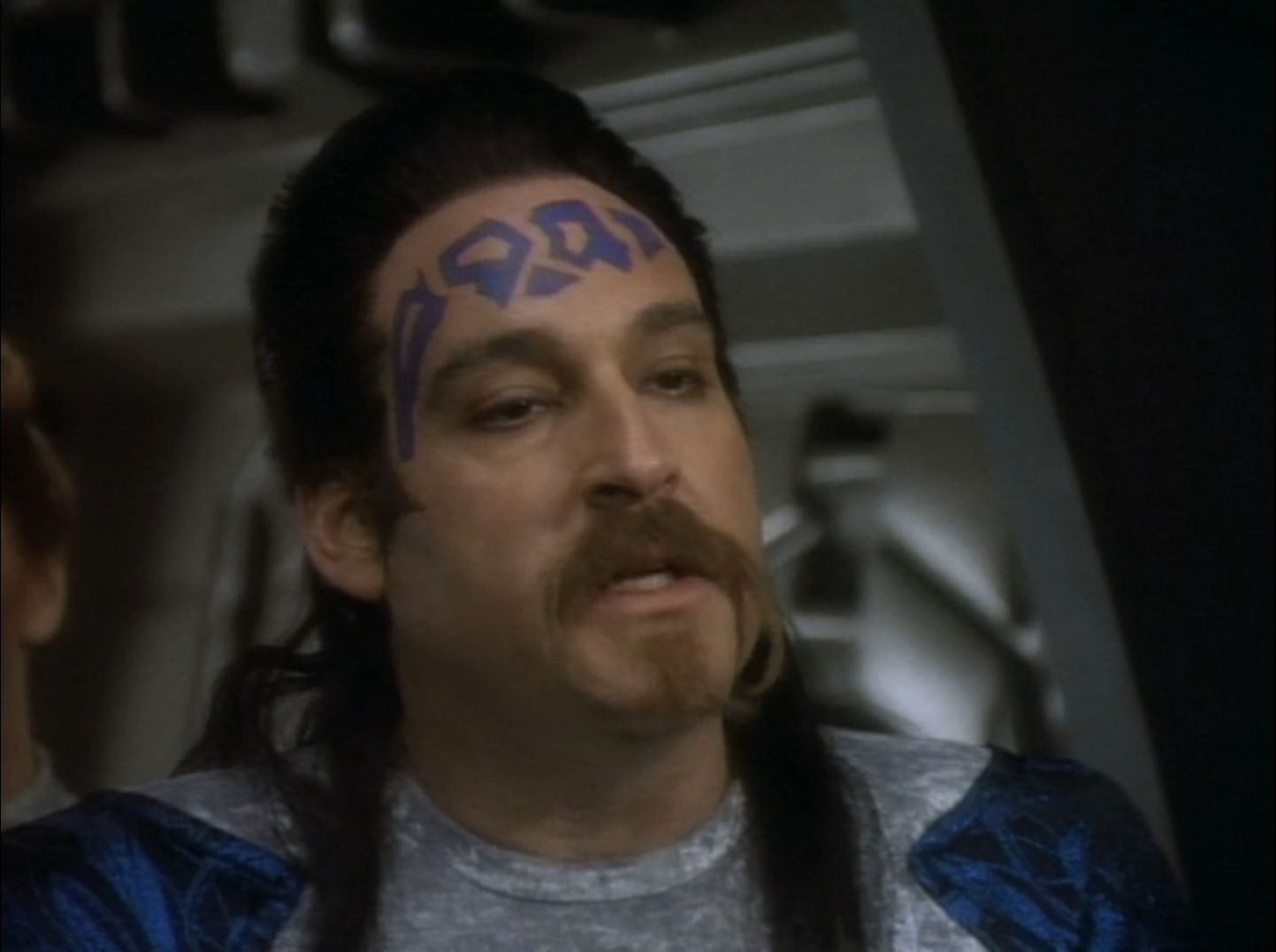 Jake, looking for his dad, finds Odo in his office, with an interesting lead in that makes you think it’s Ben for a second. Computer reports that Sisko isn’t on the station, and there is no record of him leaving. As Odo investigates, he runs into Lieutenant Security Guy – man, I thought we’d seen the last of him – acting kind of jackassy, “Constable Ohhhdoooooh! good morning to yah!” None of the senior officers reported in, but Lieutenant Security did nothing. Wow, that was a rather unsettling scene, but at least Odo has the reins. Cut back to Quark’s, and the board is ready to wagering. Quark is required to learn the rules as he plays, I hope they’re not playing Fizzbin.[2] Cut back to Sisko. He finds something. They gather on Sisko’s position and open a door to find a little Watti girl playing a version of hopscotch. They have to imitate her behavior to get past a force field and proceed. She then references a term in the game that Quark is playing. Where the lead Watti references a term the girl was saying. This is the concrete evidence that the game Quark is playing is linked to the experiences of our senior staff. Cue half way commercial.