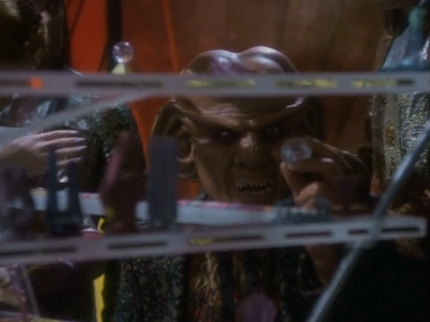 Odo comes in to Quark’s where he discloses that the 4 senior officers are missing. Quark somehow connects this to the fact that he has 4 playing pieces, or “players” on the board, and takes the safer path for them. Cut back to the 4 senior officers, who figure out that they are in a game. They emerge into some sort of cocktail party where Kira starts being needlessly defiant again. They get past the trap or whatever it is and we cut back to Quark’s. This is a very sucky game which fails to interest me even though I have a page on games in TV that I started, and I will unfortunately have to add this to it. Cue commercial as Quark does something weird with a glass onion.