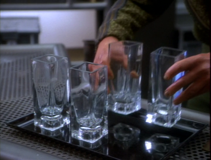 Odo takes the form of a glass on a drinks tray to sneak in where he’s not wanted. The bartender is Quark’s younger brother Rom, who, in previous episodes, has already been established as an idiot. He doesn’t notice the extra glass on the tray. They make sure to really focus on the glasses on the tray as it is carried, too. The camera lingers on it. But still, when the reveal happens, I wasn’t fully sure that I hadn’t missed something and that this wasn’t a different entity other than Odo, because it doesn’t follow any physical laws. Odo’s mass changes with his form.