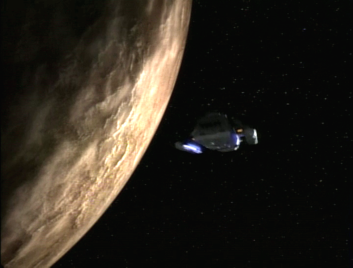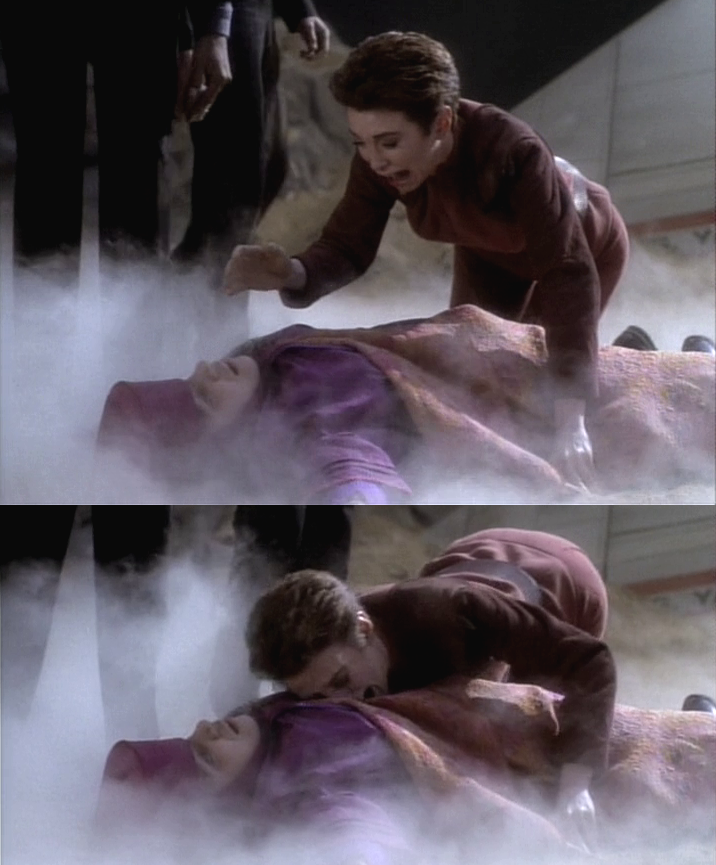 The Roundabout gets shot down by a satellite system, and they crash on the planet. The Pope-ette is killed during the crash, and Kira-the-Needlessly-Defiant is, of course, defiant towards death in her overly dramatic scene. It is unintentionally amusing in what should be a moment of high drama.