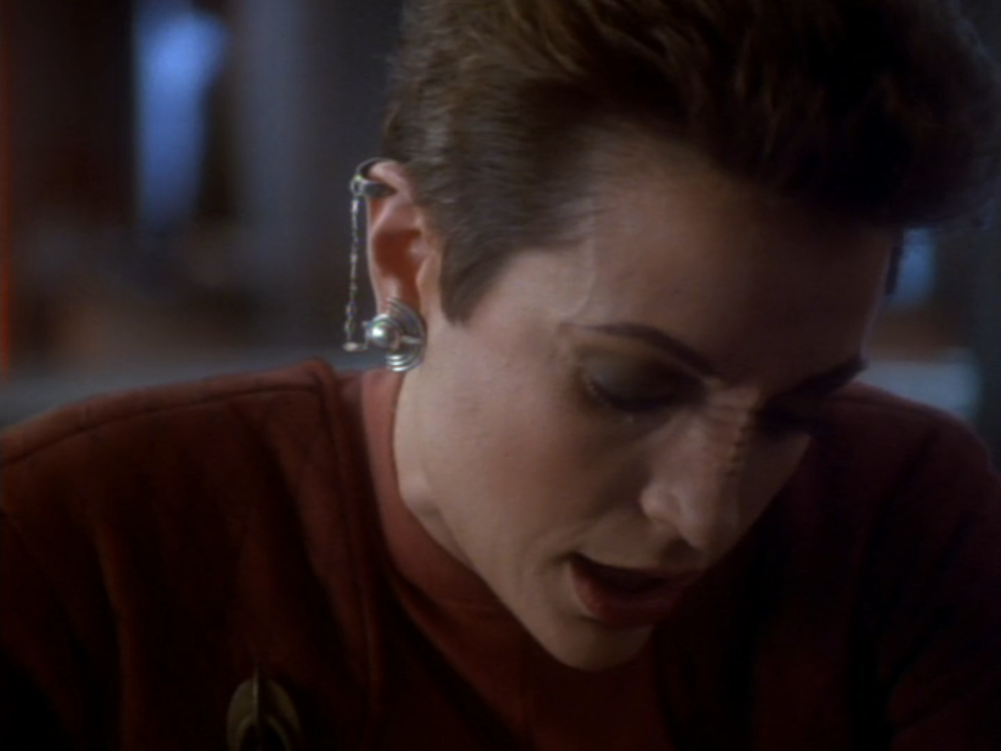 Dax is the recipient of the drink and Kira comes over to try to “recruit” Dax to her “cause.” Oh, a good shot of the earring thing, which I just now notice curiously resembles a menorah.