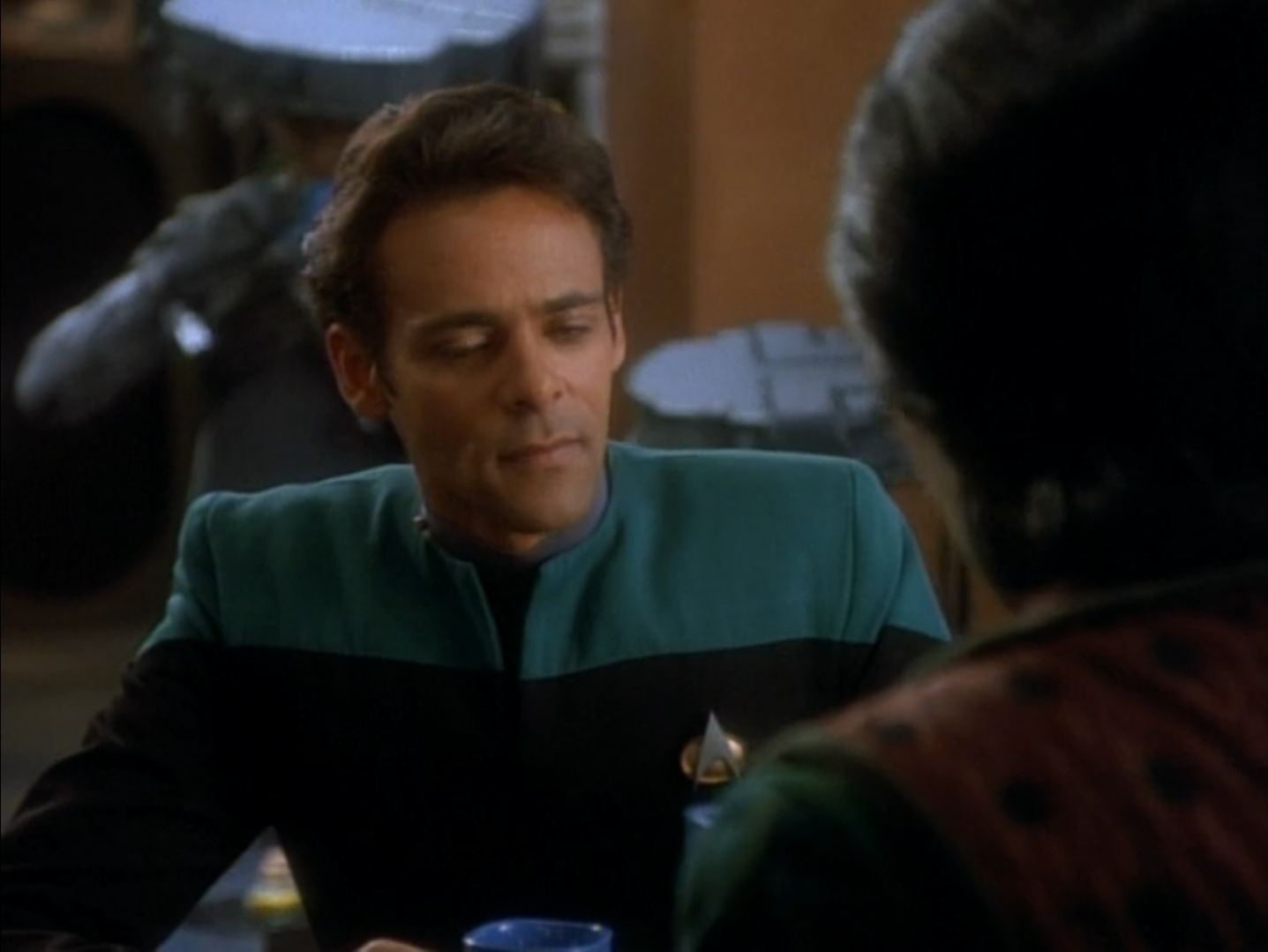 Yeah, this is good, and I’m having trouble adjusting to the review work. A very good dinner scene between Keiko, O’Brien and the Cardassian boy transpires here. Later, he and O’Brien have a heart to heart talk of sorts, and wow, do this boy’s experiences remind me of how whites are treated today.