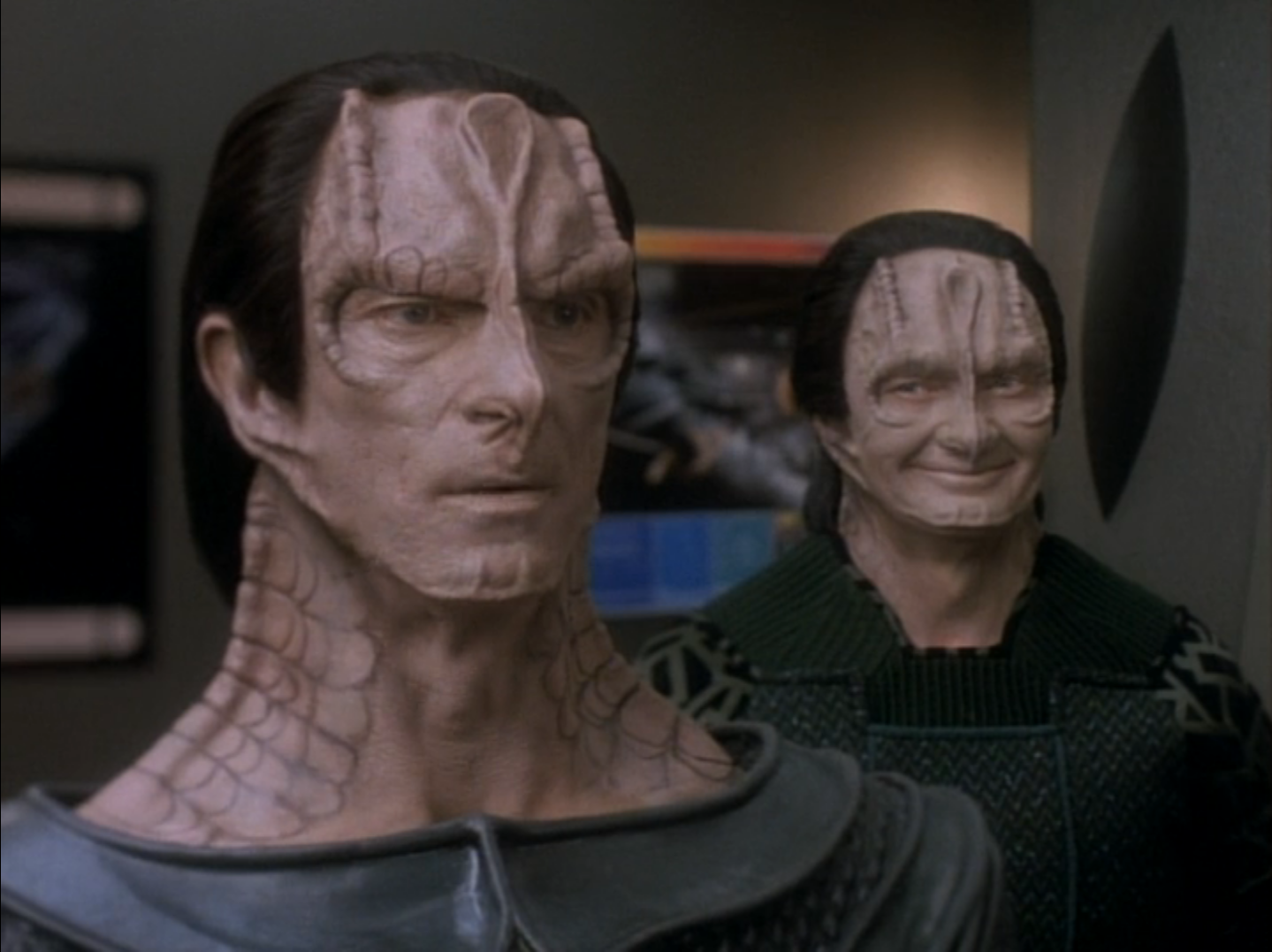 They find that the boy, Rugal, is related to a high-ranking Cardassian politician. The politician comes to see his son, and through a conversation with O’Brien, we find that O’Brien’s daughter Molly is 4, which does match her current apparent age, so hopefully no more miracle-gro baby. OK, that wasn’t that important of a part of the conversation, but it was to me due to the miracle-gro incident.