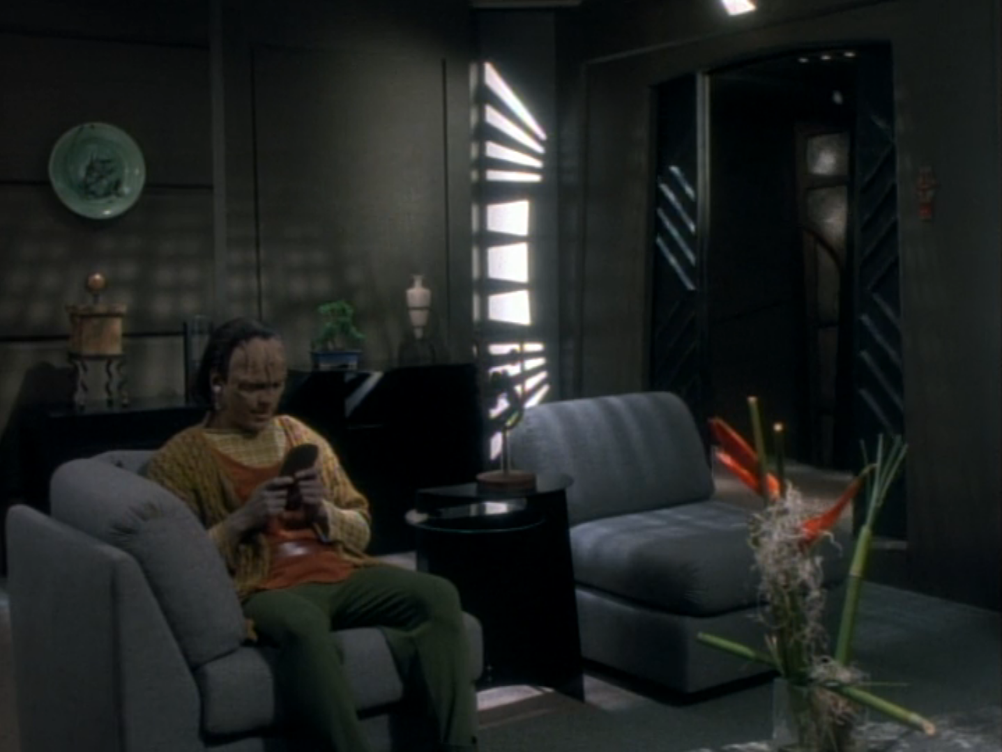 Heh, Cardassian boy is laying Tetris or something. Theses days we’d see it as texting or something on his phone.