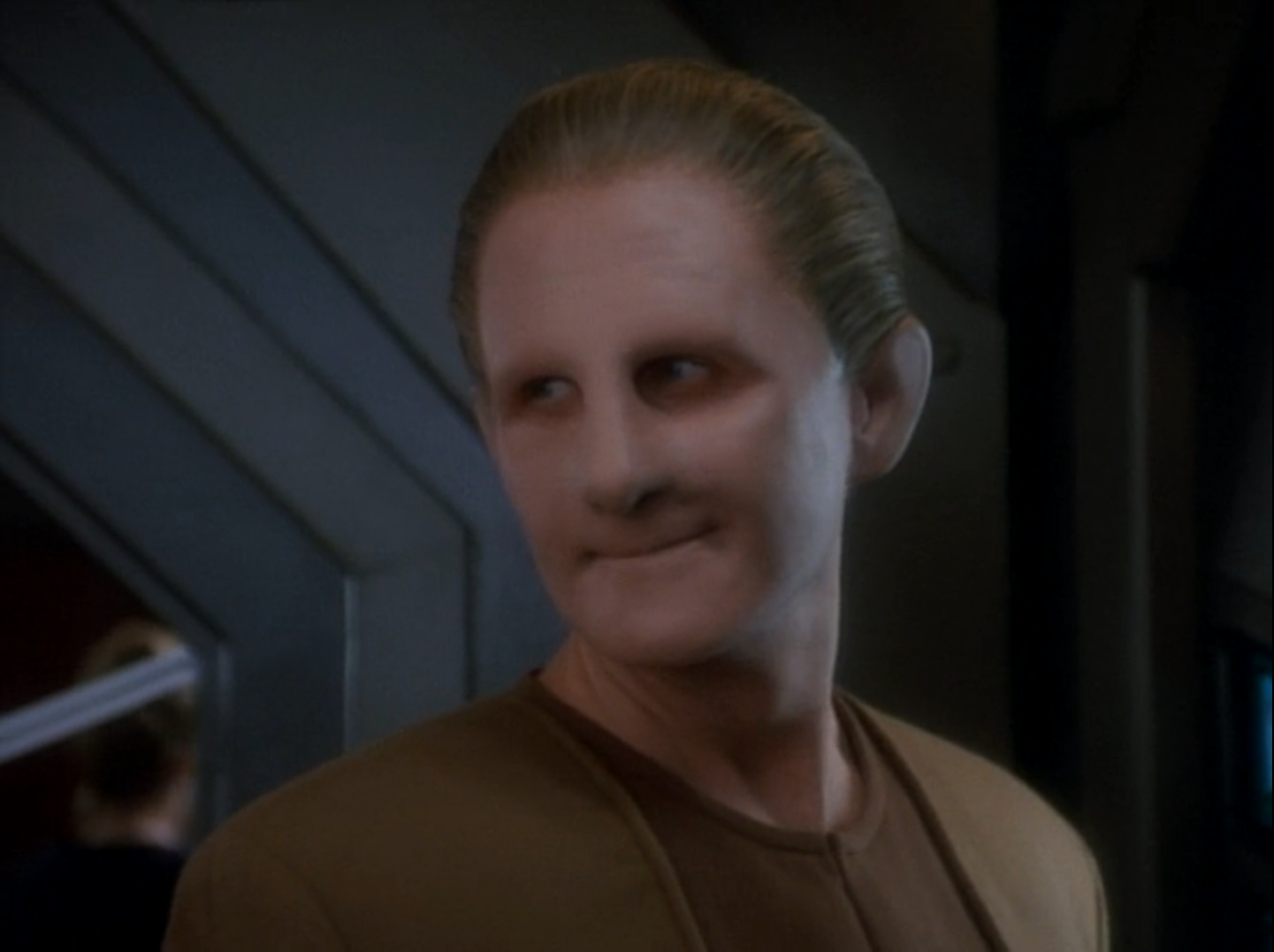 Quarks is in the middle of a business transaction when someone he knows from his past enters the bar, and states that he’s come to kill Quark. He has a freaky proboscis that connects to his chin.