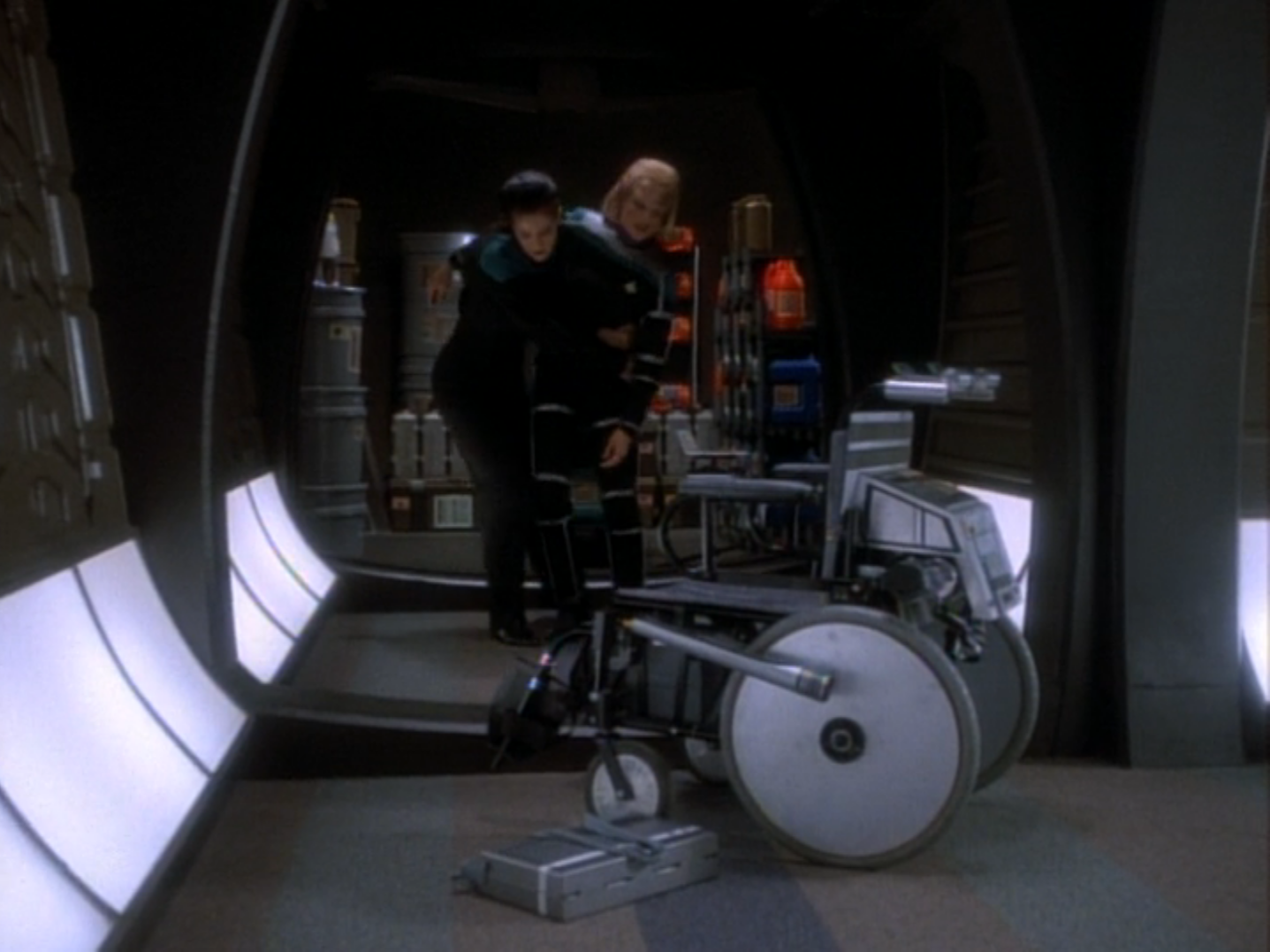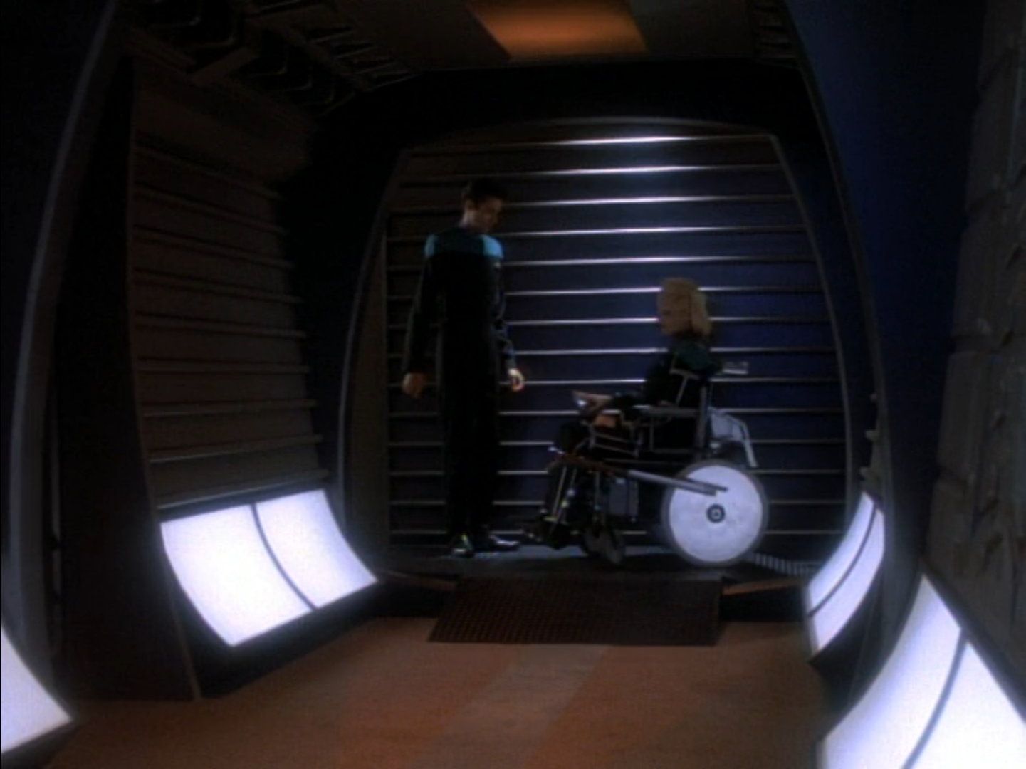 Dr. Bashir reveals to Melora that he can “fix” her “condition” so that she doesn’t need the wheelchair or servo motors to help her move, and she seems excited by that possibility.